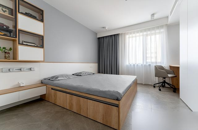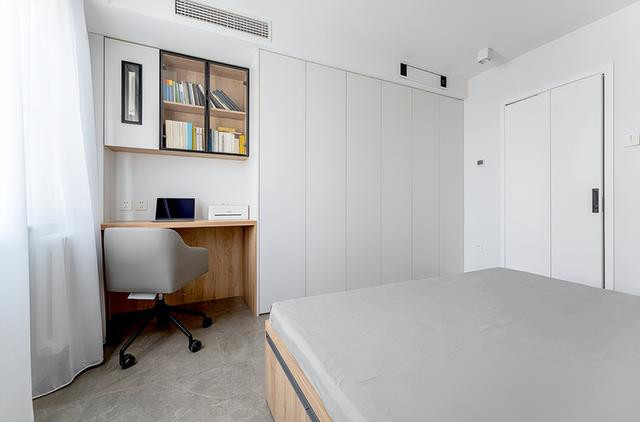 案例里的次卧衣柜和书桌一体,床头护墙板和床头柜连起来,视觉上一点不杂乱,反而显空间大。
