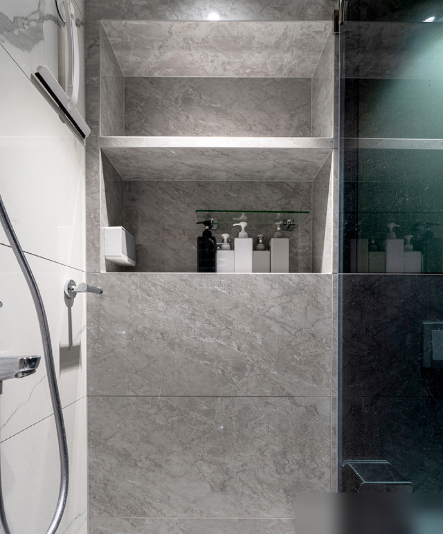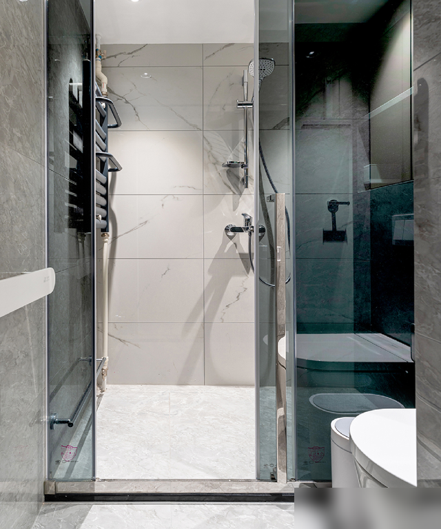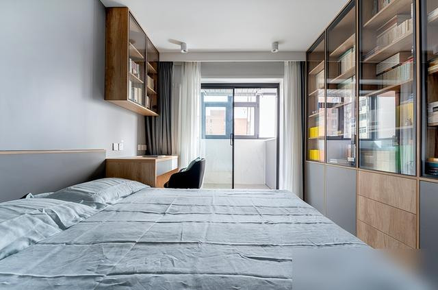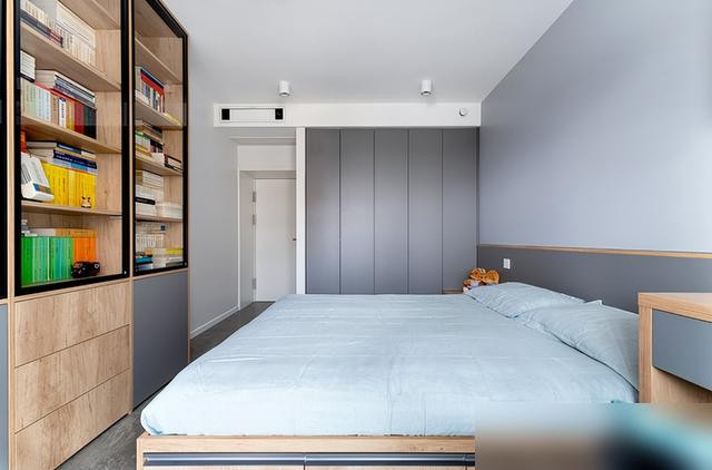 设计师把次卧门洞平移,床尾直接嵌了一组衣柜,床头两边瞬间宽敞了;主卧虽然床尾没法嵌柜,但给衣柜侧面切个角,动线流畅还塞下了大量书籍。